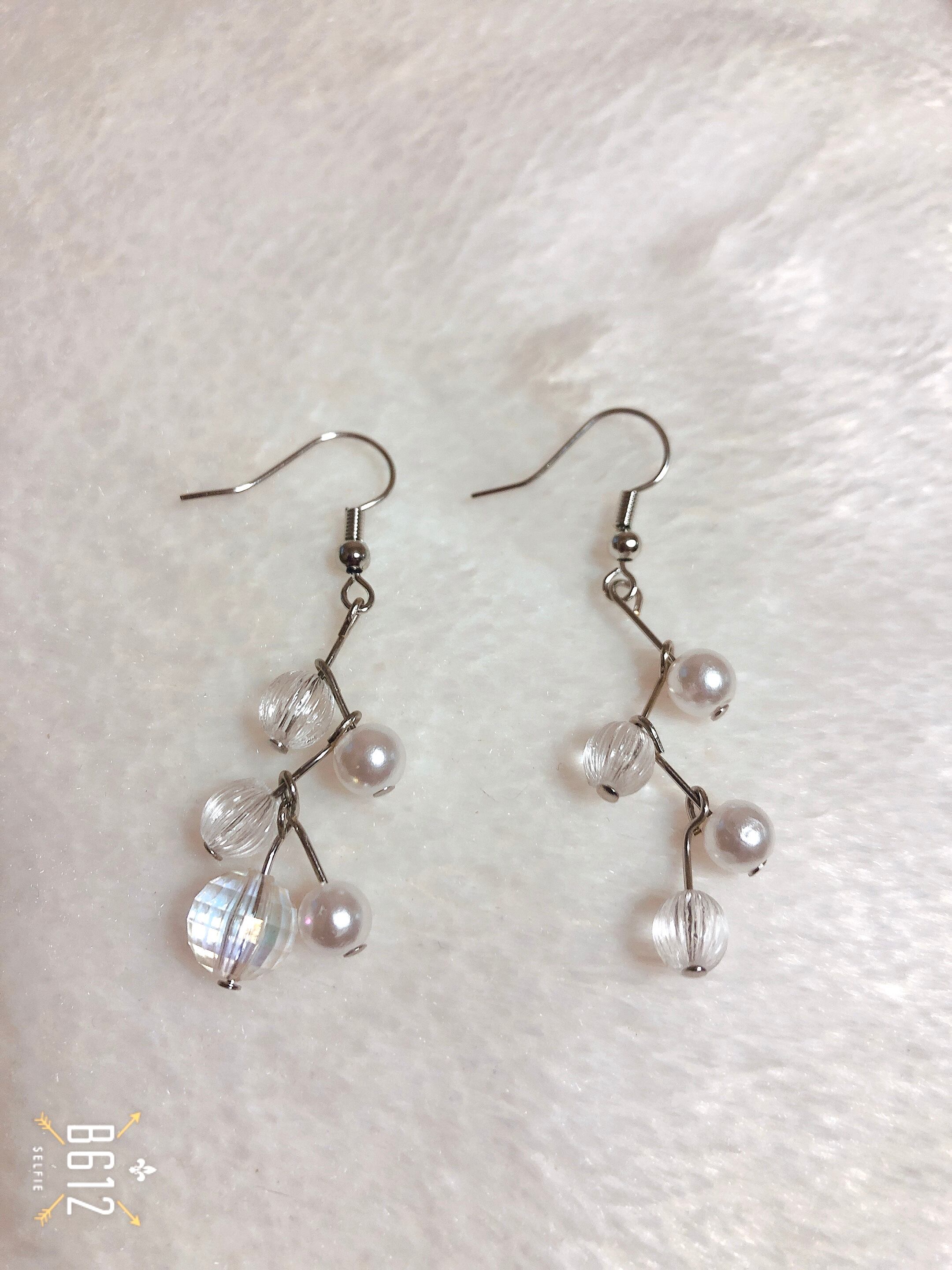 シルバーのワイヤーピアスに似た枝分かれのピアスをシルバーピンで作りました!!ホワイトパールビーズとレザーガラスビーズのふたつを枝先に着いた木の実のように見立てて作りました!!