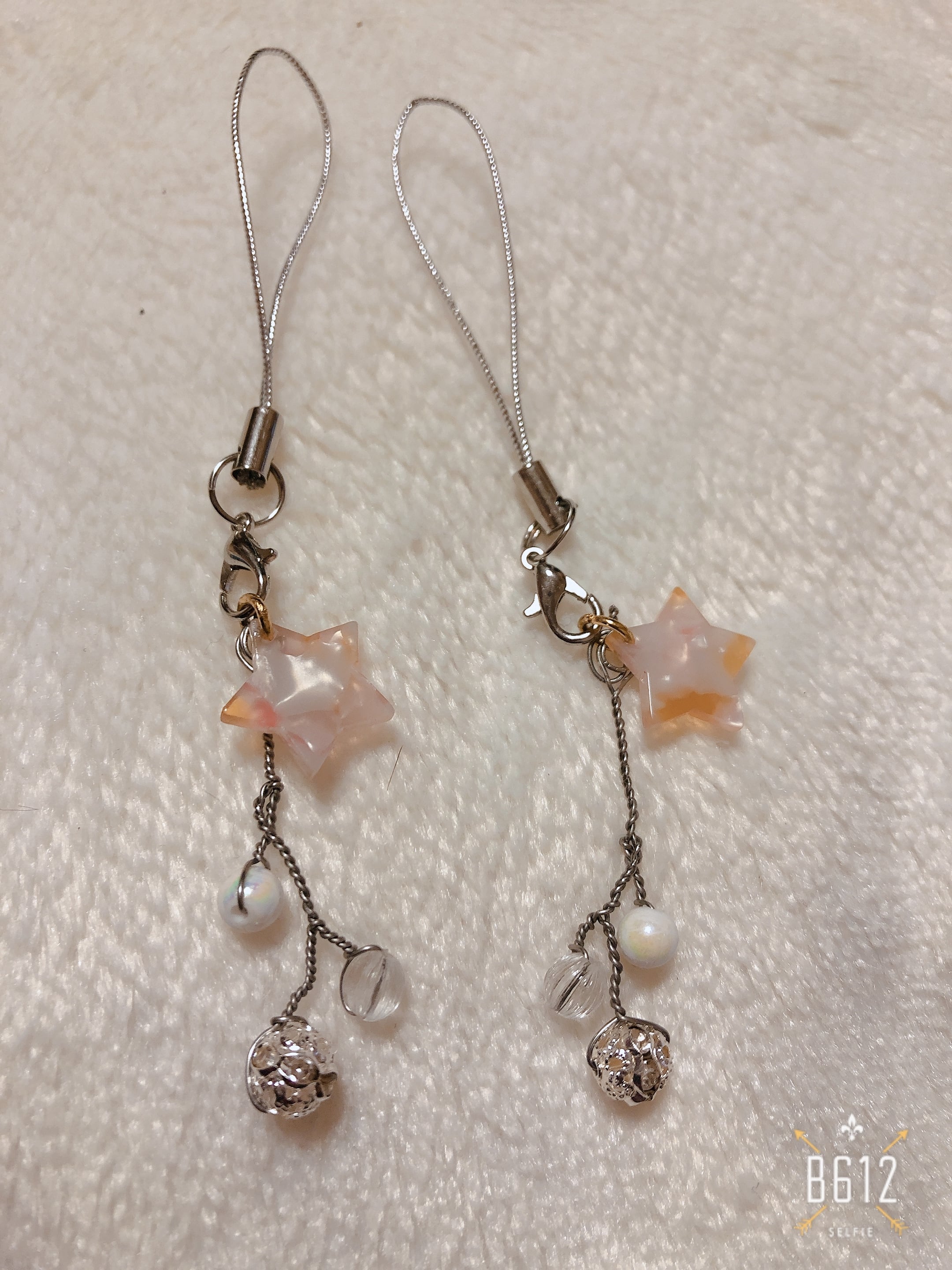 シルバーワイヤー(ステンレス)の枝分かれ調の物に星型の淡いピンクのまばら模様のものをアクセントにしています!!