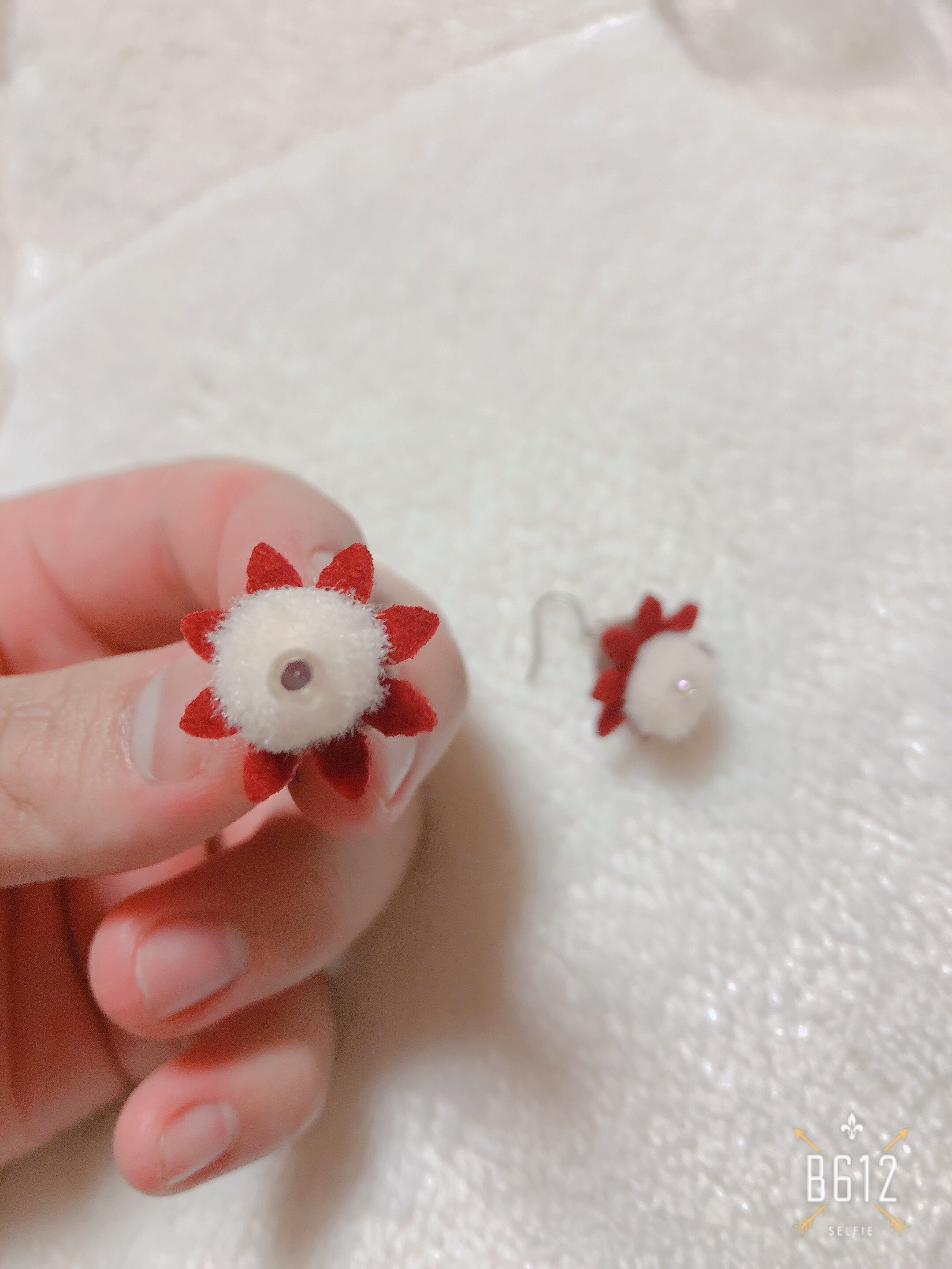 2色のコットンボールの間にキラキラした淡い透明のビーズと、角度を変えて見ると形が分かる、ワインレッドのお花型のコットンを使用しています!!