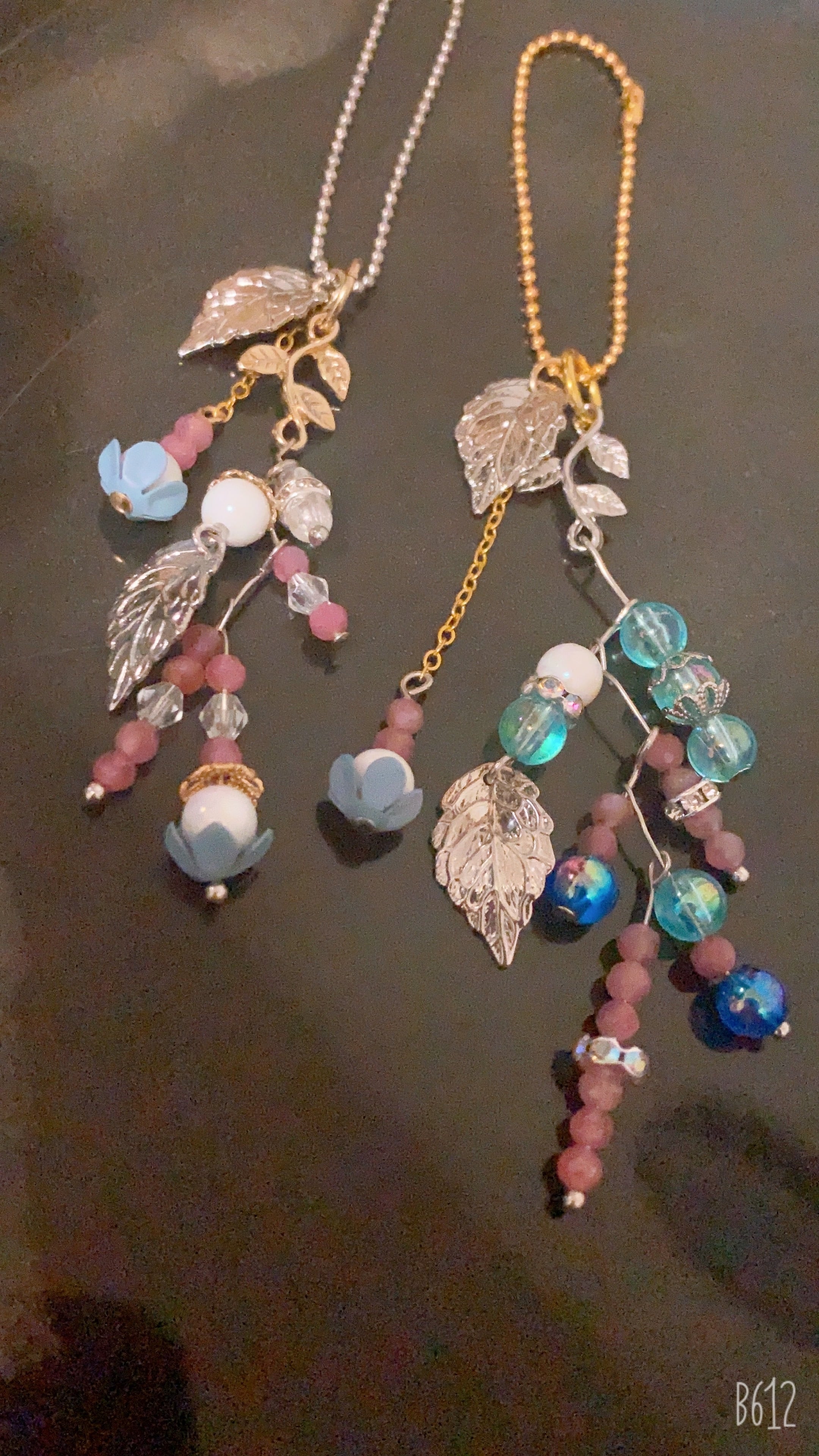 チェーンで垂らした石や葉っぱが揺れることでより綺麗に見え小さい石を使用したことにより可愛さも演出できたのでこちらの子達をたくさんの思い出と共にお客様の傍にあれたら幸いでございます。